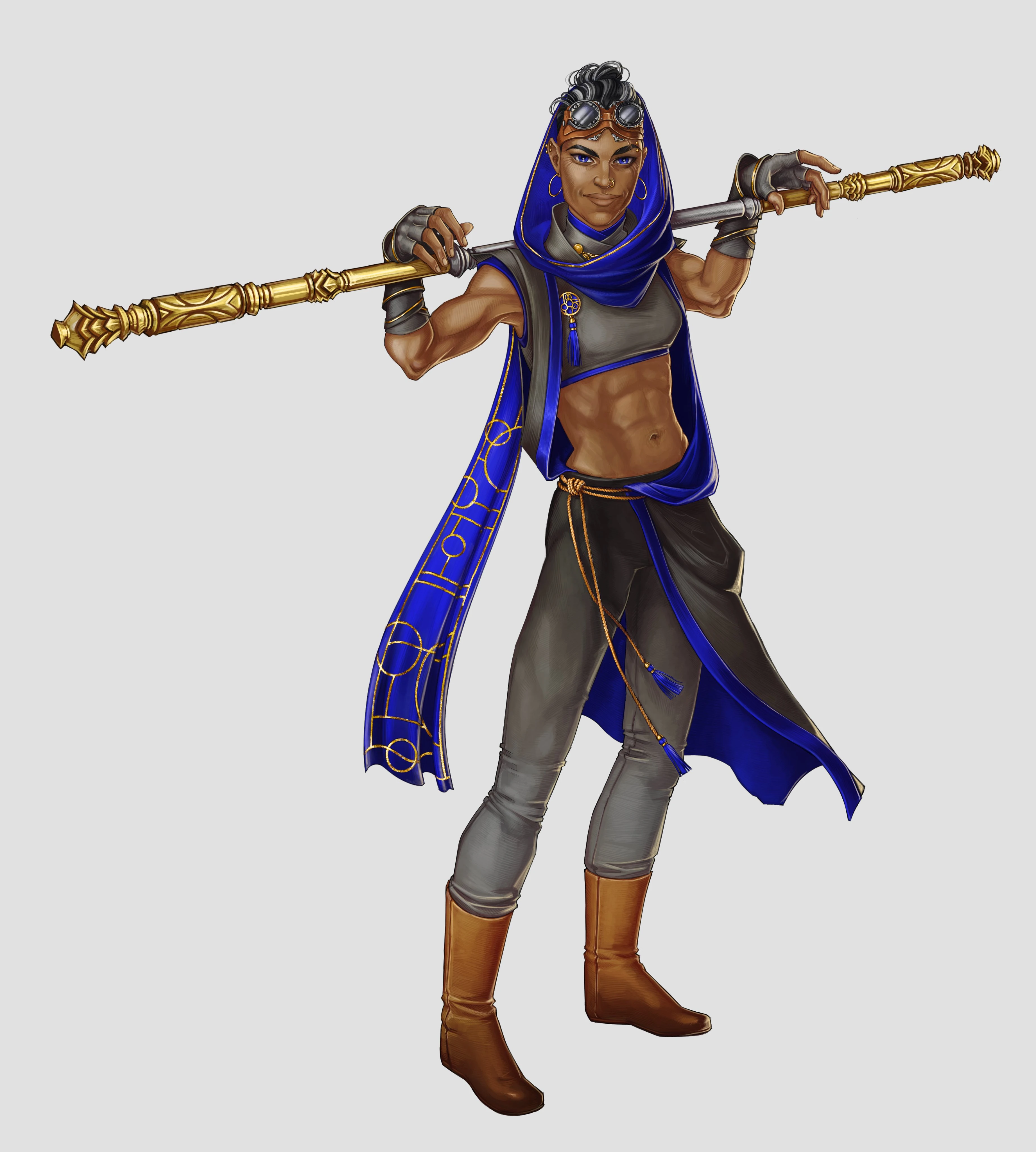 But you manage to get into the heart of the camp, using a combination of stealth and Imogen using her bright purple hair and her resemblance to her mother, a high ranking general in this group, to clear their way. Eventually, though, you do get caught, get in a small scuffle with some various guards. You manage to knock them out and even destroy one of the automatons, but then a figure in blue monk robes and a desert mask grabs Imogen and drags her into a tent. It happens so quickly that it takes a moment to notice she's gone, but then you rush to look for her and find her and the woman in a nearby tent, the woman's arm around Imogen's neck in a headlock, other hand pressed against her back, stunning her in place.